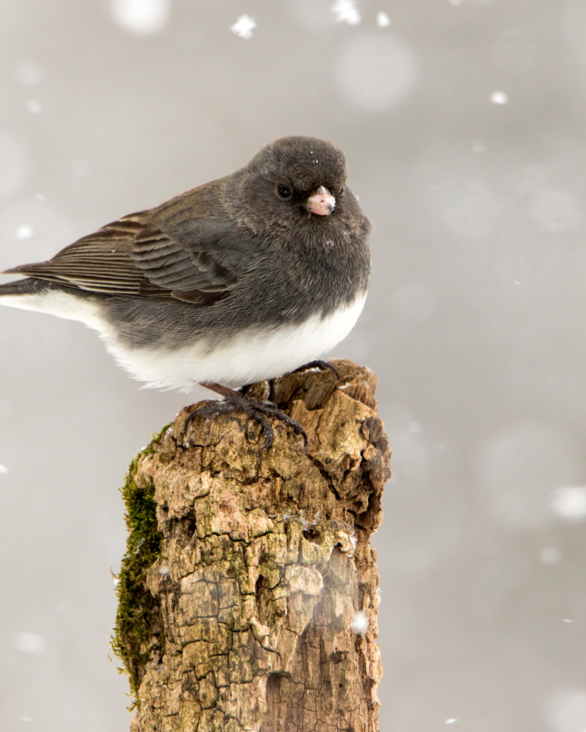Is it just fate or an ancient rhythm of life that often brings the first snowfall and the first Junco sighting at the same time each year? Whatever the explanation, Dark-eyed Juncos are often called “Snowbirds,” and many people believe their return from their northern breeding grounds does indeed foretell the return of winter’s cold and snowy weather. Even its white belly plumage and slate-colored back reminds one of a winter scene with its “leaden sky above, and snow below.”